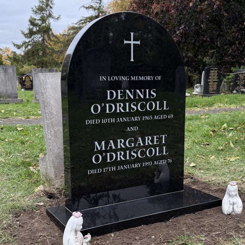Granite is a very popular material for headstones and over the past 20 years or so has been become the standard offering for most memorial masons in the UK. Granite headstones are available in a range of colours, including black, reds, greens, blues, and pale greys which can be finished with a polished shiny surface or a honed to a matt effect.